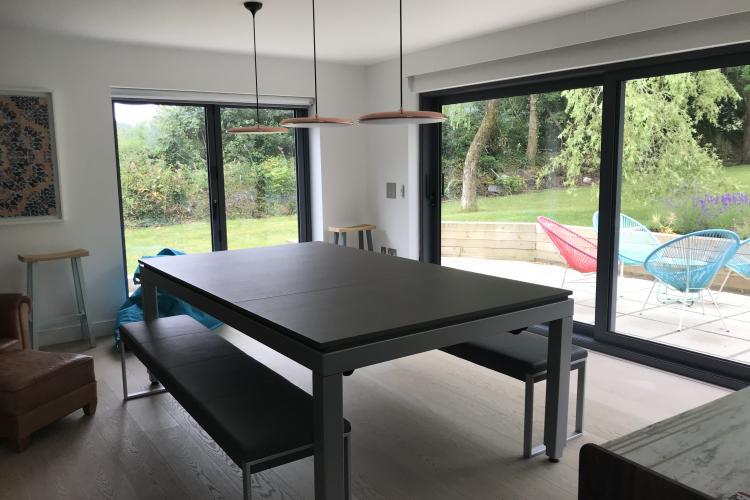 Der Fusiontables-Tisch ist eine Kreation von Saluc, einem belgischen Unternehmen mit mehr als 85 Jahren Erfahrung in der Herstellung von Billard und zugehörigem Zubehör.